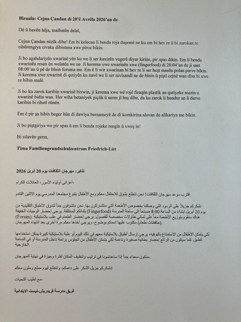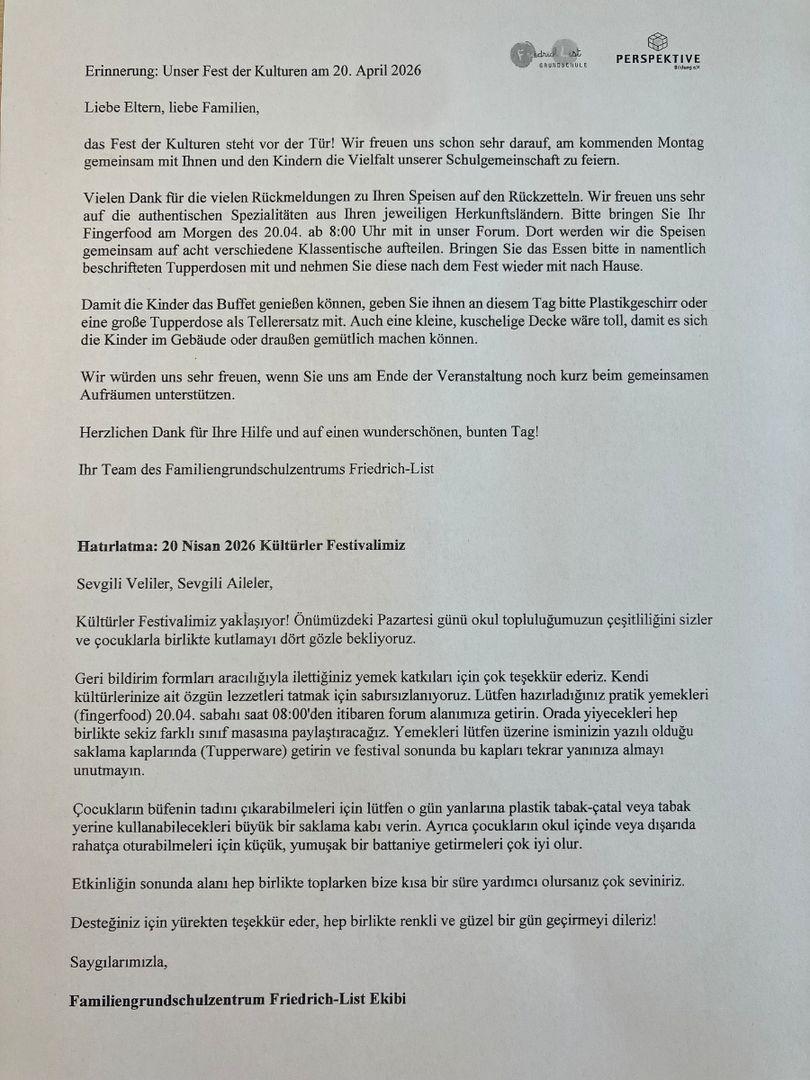 Liebe Eltern, das Fest der Kulturen steht vor der Tür. Wir freuen uns schon sehr darauf, am kommenden Montag, 20.4., mit Ihnen und den Kindern die Vielfalt unserer Schule zu feiern.